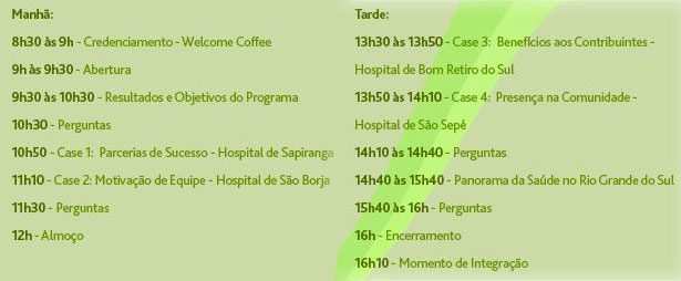 O evento visa apresentar o programa da concessionária e mostrar como hospitais em dificuldades podem aderi-lo. O Deputado federal e ex-secretário de Saúde do Estado, Osmar TerraAMRIGS, será um dos palestrantes.