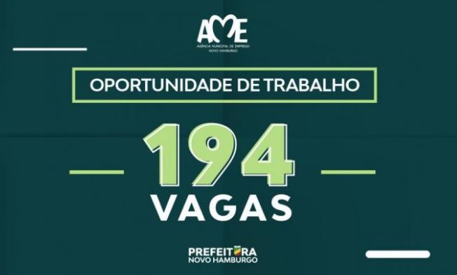 Quem está procurando uma vaga no mercado de trabalho pode buscá-la na Agência Municipal de Emprego (AME) de Novo Hamburgo, que está com 194 oportunidades de empregos abertas em sua unidade. Para se candidatar a uma das vagas, basta o candidato comparecer à Agência, que fica na Rua Joaquim Pedro Soares, número 349, no Centro, de segunda a sexta-feira, das 08h às 13h, com a carteira de trabalho.