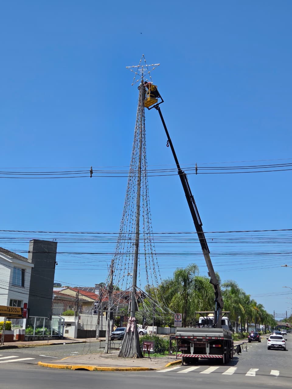 Com 18 metros de altura e uma estrela de 2,20 metros no topo, a estrutura conta com 928 lâmpadas e cerca de 290 metros de bastonetes iluminados. A montagem teve início neste fim de semana, com o auxílio de um caminhão Muck e o trabalho de quatro pessoas.