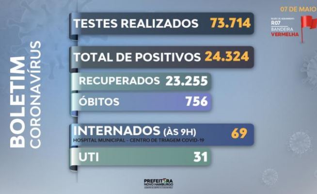 Novo Hamburgo registrou nesta sexta-feira, 07, mais 164 novos casos e dois óbitos de moradores do município com coronavírus. Os óbitos publicados hoje ocorreram nos dias 30/04 e 06/05.