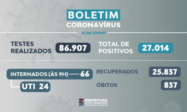 Com a atualização Novo Hamburgo chega a 27.014 casos confirmados e 837 mortes associadas à covid.