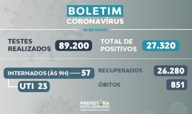 Com a atualização Novo Hamburgo chega a 27.320 casos confirmados e 851 mortes associadas à covid.