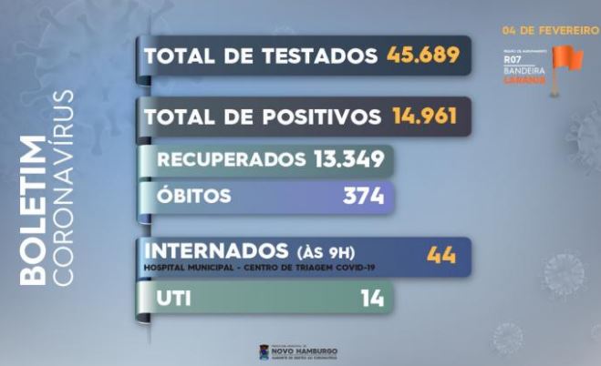 Novo Hamburgo registrou, nesta quinta-feira, dia 4, mais 116 novos casos e três óbitos de moradores do município com coronavírus. Com a atualização Novo Hamburgo chega a 14.961 casos confirmados e 374 mortes associadas à covid. As vítimas são duas senhoras de 80 e 103 anos e um senhor de 78 anos.