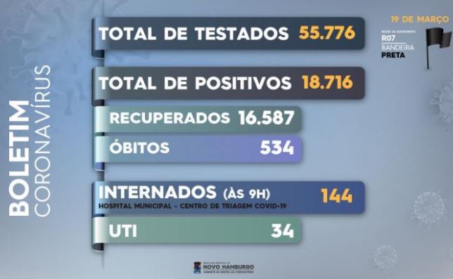 Novo Hamburgo registrou nesta sexta-feira, dia 19, mais 149 novos casos e três óbitos de moradores do município com coronavírus. Os óbitos hoje publicados ocorreram no dia 17/03.