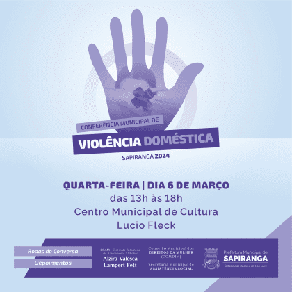 A Conferência Municipal de Violência Doméstica ocorre no dia 6 de março, das 13h às 18h, no Centro Municipal de Cultura Lucio Fleck. O evento, organizado pela Secretaria de Assistência Social, através do Centro de Referência de Atendimento à Mulher (Cram) Alzira Valesca Lampert Fett, será aberto a toda a comunidade, e contará com rodas de conversa, teatro amador, depoimentos e rede de atendimento da Comarca.