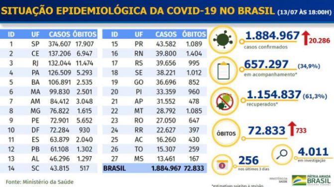 Com 733 novas mortes por covid-19 registradas nas últimas 24 horas, o Brasil chegou ao total de 72.833 óbitos em função do novo coronavírus. A atualização diária foi divulgada pelo Ministério da Saúde no início da noite de segunda-feira (13). O número de casos confirmados desde o início da pandemia chegou a 1.884.967. O sistema do Ministério da Saúde contabilizou 20.286 novos casos desde o balanço de ontem (12).