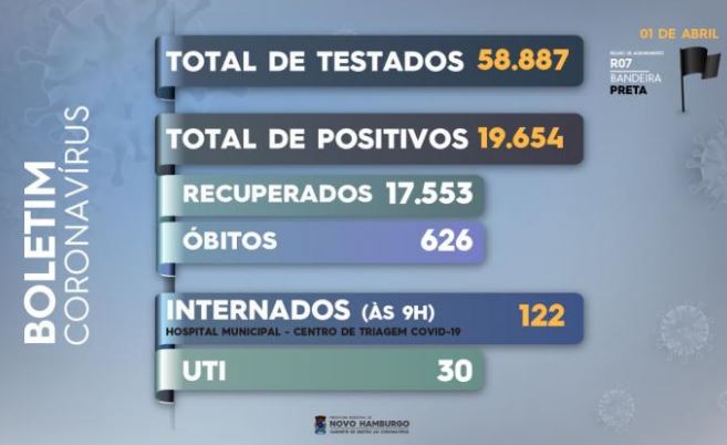 Novo Hamburgo registrou nesta quinta-feira, dia 1º, mais 90 novos casos e 12 óbitos de moradores do município com coronavírus. Os óbitos hoje publicados ocorreram entre os dias 27/03 e 01/04.