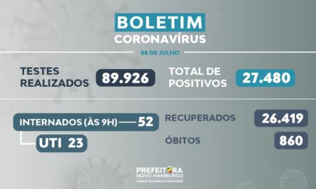 Com a atualização Novo Hamburgo chega a 27.480 casos confirmados e 860 mortes associadas à covid.