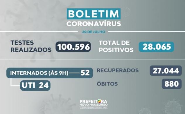 Com a atualização Novo Hamburgo chega a 28.065 casos confirmados e 880 mortes associadas à covid.