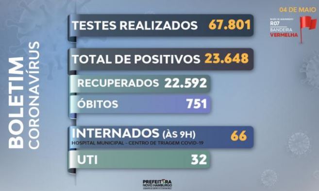 Com a atualização Novo Hamburgo chega a 23.648 casos confirmados e 751 mortes associadas à covid. A vítima é um senhor de 47 anos.