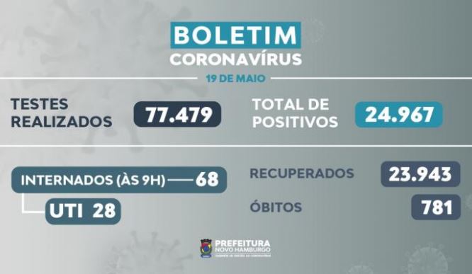 Novo Hamburgo registrou, nesta quarta-feira, dia 19, mais 78 novos casos e dois óbitos de moradores do município com coronavírus. Os óbitos publicados hoje ocorreram nos dias 01/05 e 18/05.