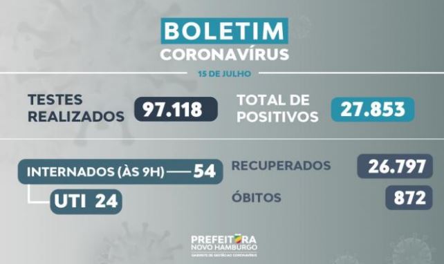 Com a atualização Novo Hamburgo chega a 27.853 casos confirmados e 872 mortes associadas à covid.