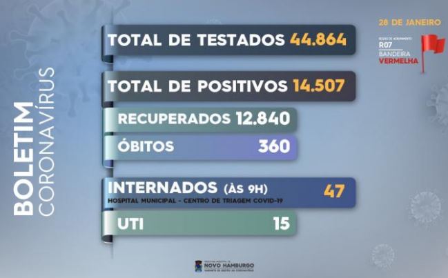 Novo Hamburgo registrou nesta quinta-feira, dia 28, mais 162 novos casos e dois óbitos de moradores do município com coronavírus. Com a atualização Novo Hamburgo chega a 14.507 casos confirmados e 360 mortes associadas à covid. As vítimas são dois senhores de 64 e 70 anos.