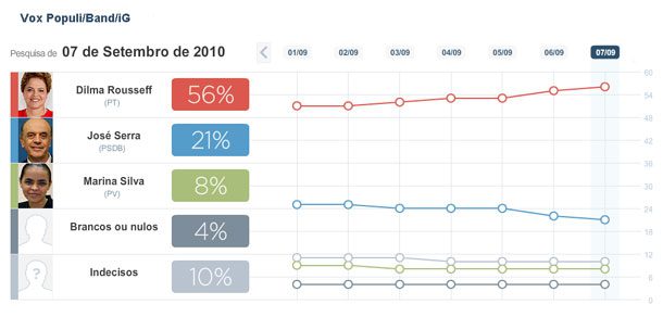 É o que revela a pesquisa diária Vox/Populi/Band/iG desta terça-feira, dia 07 de setembro – feriado da Independência. O levantamento mostra a candidata petista a 35 pontos percentuais do principal adversário: José Serra, do PSDB. O tucano aparece com 21% das intenções de voto e Marina Silva, do PV, com 8%.