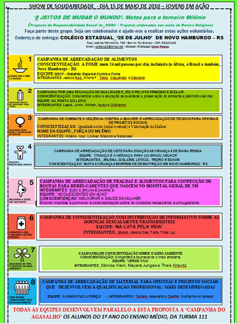 Os alunos estão divididos em oito grupos, adaptando para a realidade do município a proposta das Metas do Milênio que são conhecidas no Brasil como os “8 Jeitos de Mudar o Mundo”, que são: