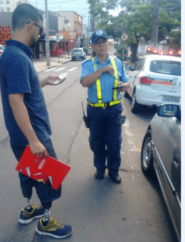 Apesar de reconhecer sua falha, ele lamenta a intransigência da fiscal. “Quando voltei, a agente estava lá me esperando. Pensei que quando ela visse que eu sou deficiente, não fosse me multar. Mas nem quis me escutar. Só queria me dizer que eu estava errado e tinha que ter a credencial.” A discussão entre Quadros e a servidora foi fotografada pelo cunhado do motorista. Na imagem, é possível ver as próteses de Quadros.