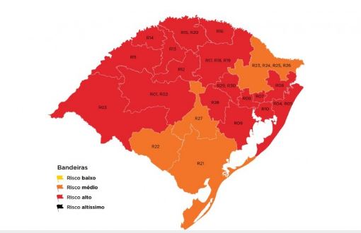 Ainda assim, a grande maioria das regiões segue em bandeira vermelha, ou seja, com risco alto para esgotamento da capacidade hospitalar e velocidade de propagação do vírus no Estado. As 17 regiões em vermelho somam 78,4% da população gaúcha, enquanto no mapa anterior eram 86% dos habitantes nas 19 regiões.