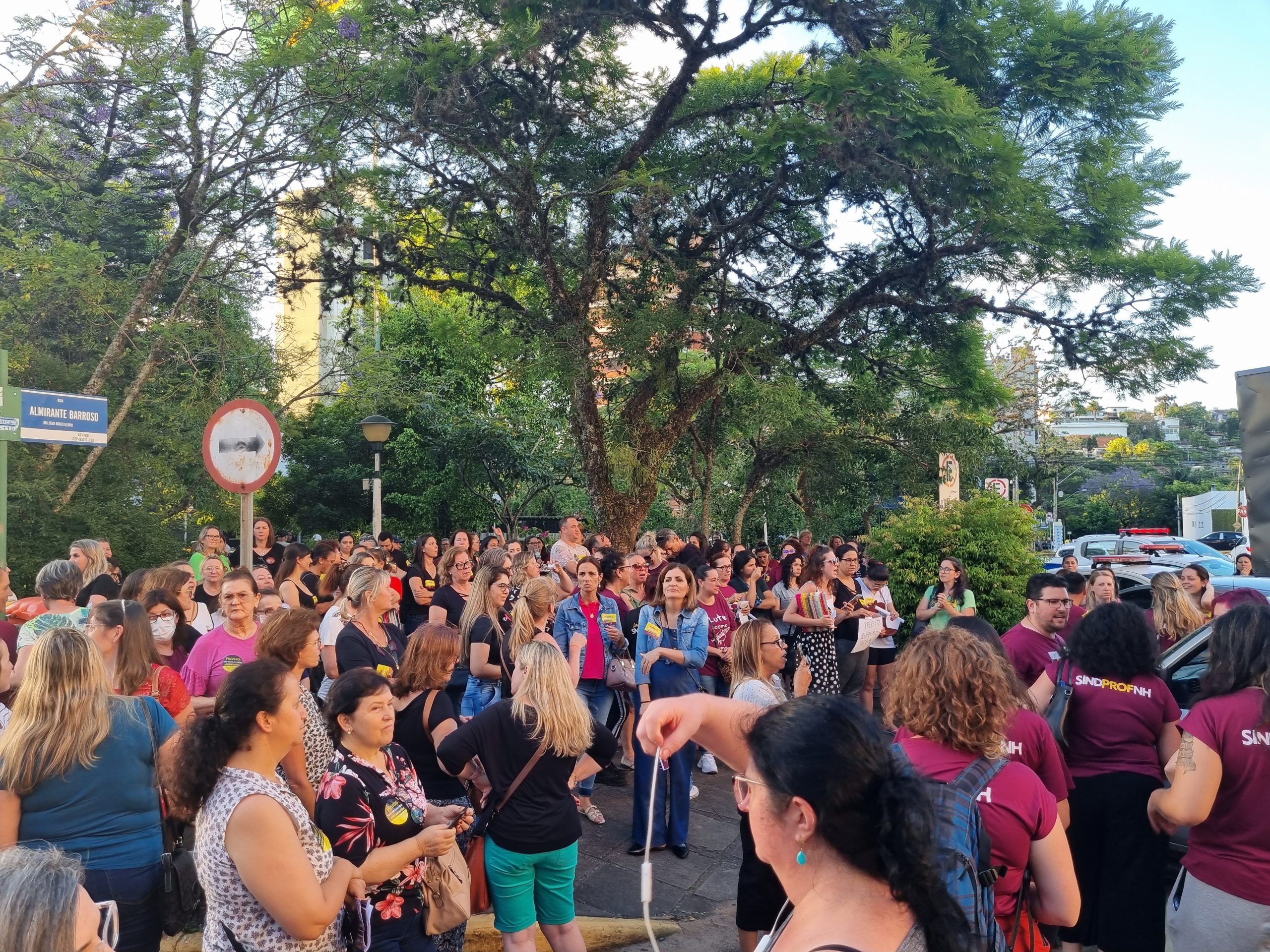 Os servidores, que serão afetados pelos projetos, protestam entre mais de 150 pessoas, ocupando o plenário e a rua Almirante Barroso. Em meio aos projetos, o Sindicato dos Professores Municipais de Novo Hamburgo (Sindprof) fez uma assembleia hoje, com servidores públicos, e está decidido: caso não haja retirada dos projetos, o Sindicato decretará greve a partir de quinta-feira (1).