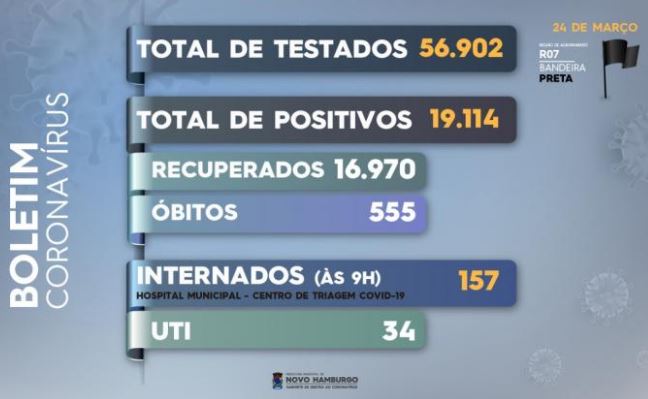 Com a atualização Novo Hamburgo chega a 19.114 casos confirmados e 555 mortes associadas à covid. As vítimas são oito senhores 83, 80, 79, 73, 70, 58, 57 e 45 anos e uma senhora 69 anos.