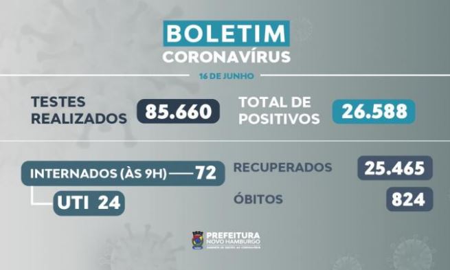 Com a atualização Novo Hamburgo chega a 26.588 casos confirmados e 824 mortes associadas à covid.