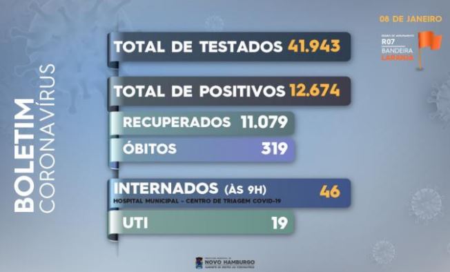 Novo Hamburgo registrou, nesta sexta-feira, dia 8, mais 102 novos casos e quatro óbitos de moradores do município com coronavírus. Com a atualização Novo Hamburgo chega a 12.674 casos confirmados e 319 mortes associadas à covid. As vítimas são dois senhores de 76 e 79 anos e duas senhoras de 54 e 63 anos.