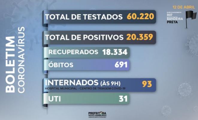 Novo Hamburgo registrou nesta segunda-feira, 12, mais 153 novos casos e dezessete óbitos de moradores do município com coronavírus. Os óbitos hoje publicados ocorreram nos dias 06/03, 13/03, 07/04, 09/04, 10/04, 11/04 e 12/04.