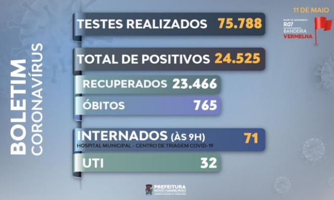 Com a atualização Novo Hamburgo chega a 24.525 casos confirmados e 765 mortes associadas à covid. A vítima é um senhor de 67 anos.