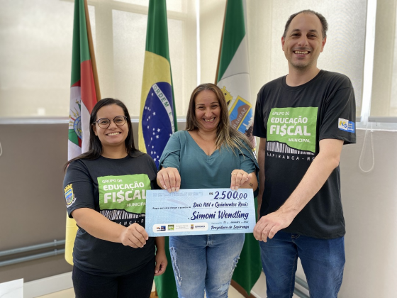 A campanha Nota Fiscal Consciente Sapiranga Premia fechou a edição de 2023 com a entrega do prêmio de R$ 2.500,00. A ganhadora foi a industriária Simoni Wendling, moradora do bairro Centenário, que recebeu um cheque simbólico na tarde desta terça-feira, 19, no gabinete da prefeita Carina Nath.