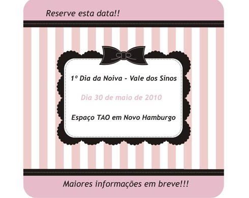 Recebemos a identidade visual do 1º Dia da Noiva – Vale dos Sinos, evento que terá como palco o Espaço Tao em Novo Hamburgo e tem a organização da Manuela Damasceno, que promete reunir vários profissionais do ramo de organização de casamentos. Coloque na agenda!