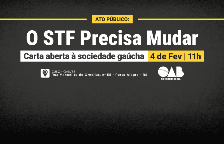 A Ordem dos Advogados do Brasil – Seccional Rio Grande do Sul (OAB/RS) realizou hoje, 4 de fevereiro, em Porto Alegre, um ato público com o tema “O STF precisa mudar – Carta aberta à sociedade gaúcha”. A atividade ocorreu no auditório da OAB Cubo e contou com participação presencial e transmissão on-line.