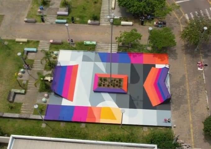 A maior ação da praça é a linda pintura e revitalização da pista de Skate. Com obras do renomado e admirado artista hamburguense Bruno Schilling, um verdadeiro especialista em arte, quem olha de cima vê, animado, a realização de uma pintura perfeita. “Tenho há bastante tempo a vontade de pintar o chão desta pista. Então, veio o convite, e primeiro pintamos as laterais. Agora, pintamos todo o chão”, conta o artista hamburguense.