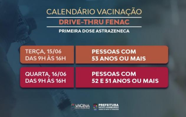 Avança o sistema de vacinação contra a covid-19 em Novo Hamburgo. Na quarta-feira, 16, haverá drive-thru para imunização de pessoas com 51 e 52 anos sem comorbidades e amanhã, terça-feira, dia 15, é a vez de pacientes com 53 anos de idade receberem a vacina contra o coronavírus.